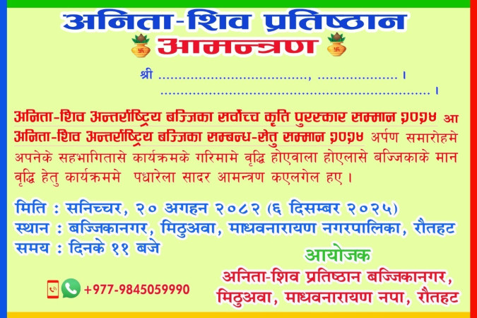 अनिता–शिव प्रतिष्ठानले अन्तर्राष्ट्रिय बज्जिका सम्मान आयोजना गर्दै